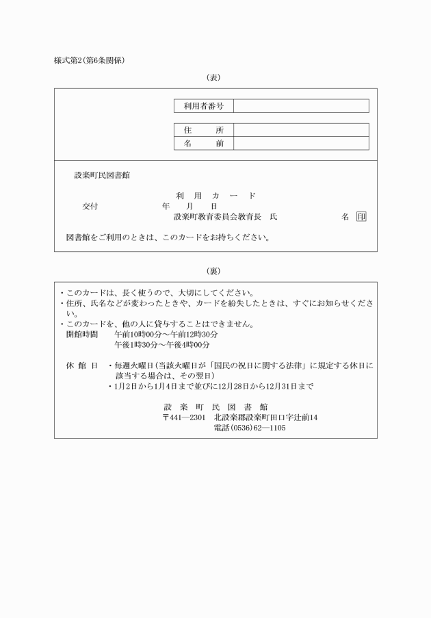 第6条 図書資料の館外貸出しを受けようとする者は、図書館利用カード(以下「利用カード」という。)(様式第2)の交付を受け、利用の際、これを館長に提示しなければならない。