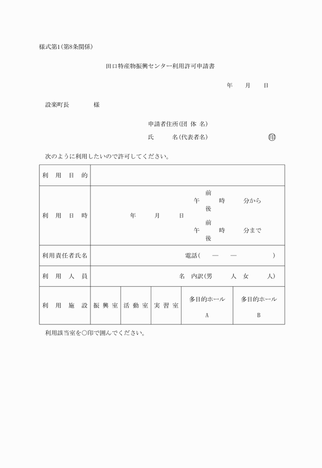 第9条 利用者は、利用しようとする施設の利用期間その他利用許可書に記載された事項を変更しようとするときは、田口特産物振興センター利用変更許可申請書(様式第3)に利用許可証を添えて町長に提出し、その許可を受けなければならない。