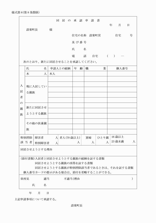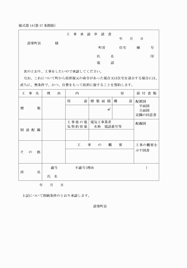 第16条 条例第24条第1項第3号及び条例第57条第1項第3号の規定により承認を得ようとする入居者は、一部用途変更承認申請書(様式第13)を町長に提出しなければならない。