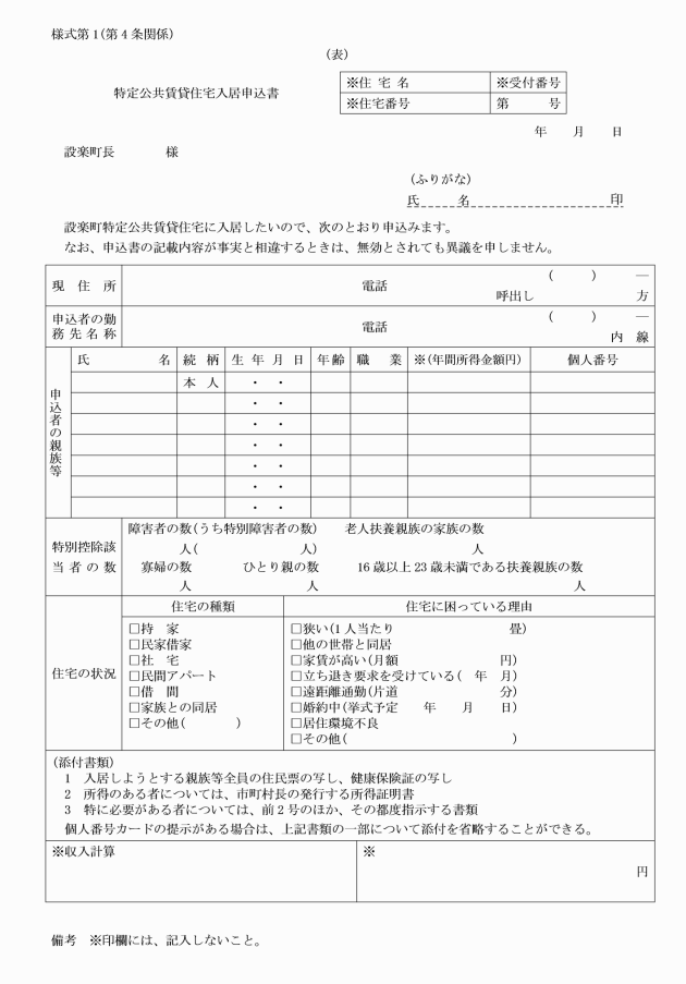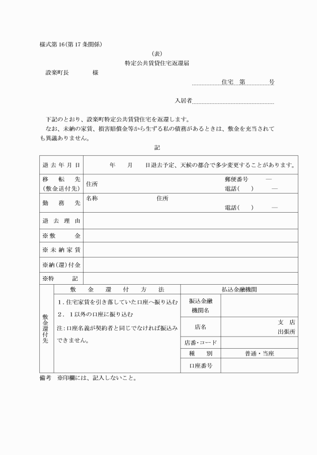 第16条 入居者は、同居する世帯員に異動があったときは、異動のあった日から14日以内に特定公共賃貸住宅入居世帯員異動届(様式第15)を町長に提出しなければならない。