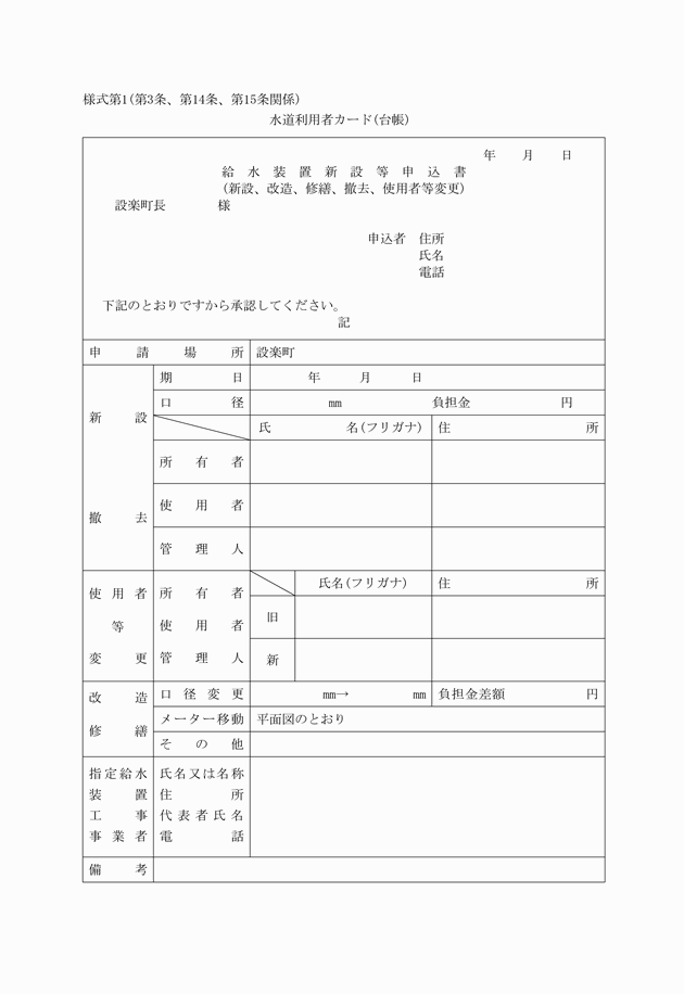 第7条 給水工事の申込者が自己の材料(既設配管等を含む。)を使用しようとするときは、あらかじめ町長に申し出て、その検査を受け承認されたものを使用することができる。
