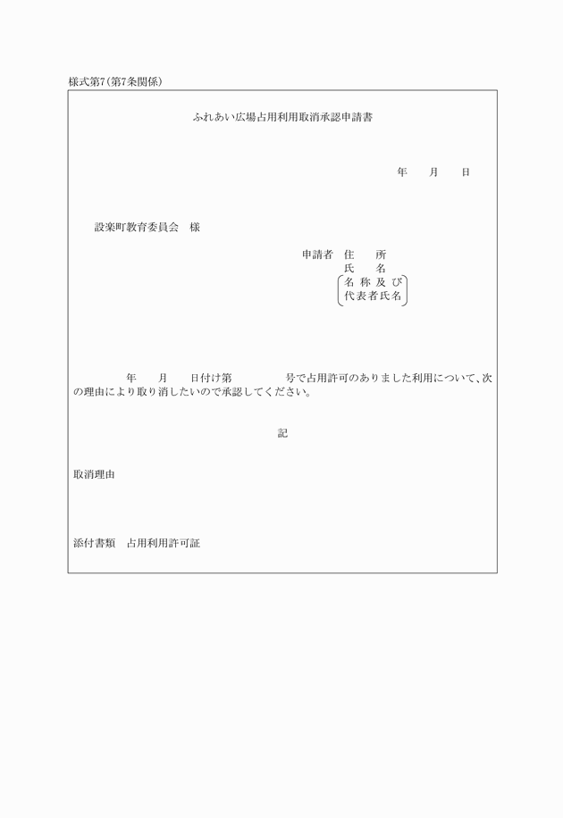 第7条 占用利用者は、許可施設の占用利用の取消しをしようとするときは、ふれあい広場占用利用取消承認申請書(様式第7)に許可証を添えて、速やかに教育委員会に提出し、その承認を受けなければならない。