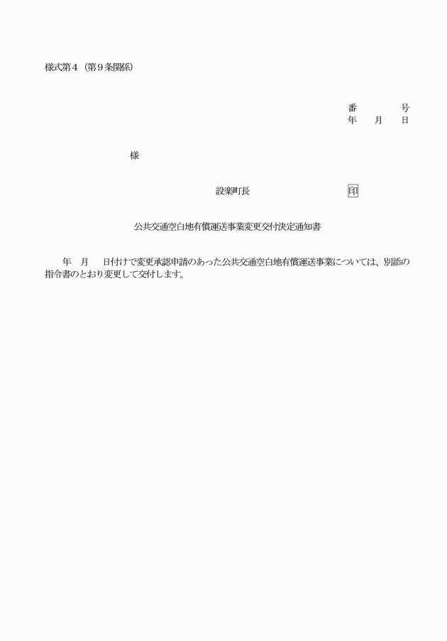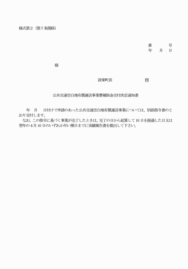 第6条 補助金の交付を申請しようとする者(以下「申請者」という。)は、公共交通空白地有償運送事業費補助金交付申請書(様式第1)に必要な書類を添付して、町長に提出しなければならない。