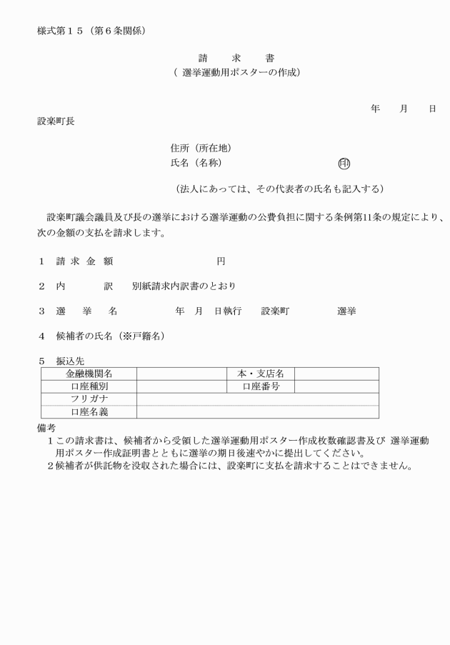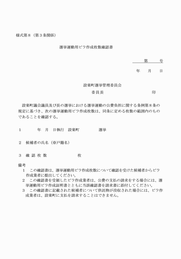 第1条 この告示は、設楽町議会議員及び長の選挙における選挙運動の公費負担に関する条例(令和2年設楽町条例第21号。以下「条例」という。)第12条の規定に基づき、条例の施行に関し必要な事項を定めるものとする。