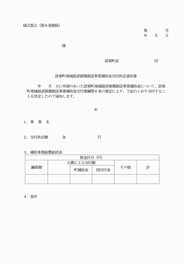 第8条 補助事業者は、申請内容を変更し、又は取り下げしようとするときは、設楽町地域経済循環創造事業補助金変更(取下げ)承認申請書(様式第4)を町長に提出し、あらかじめその承認を得なければならない。